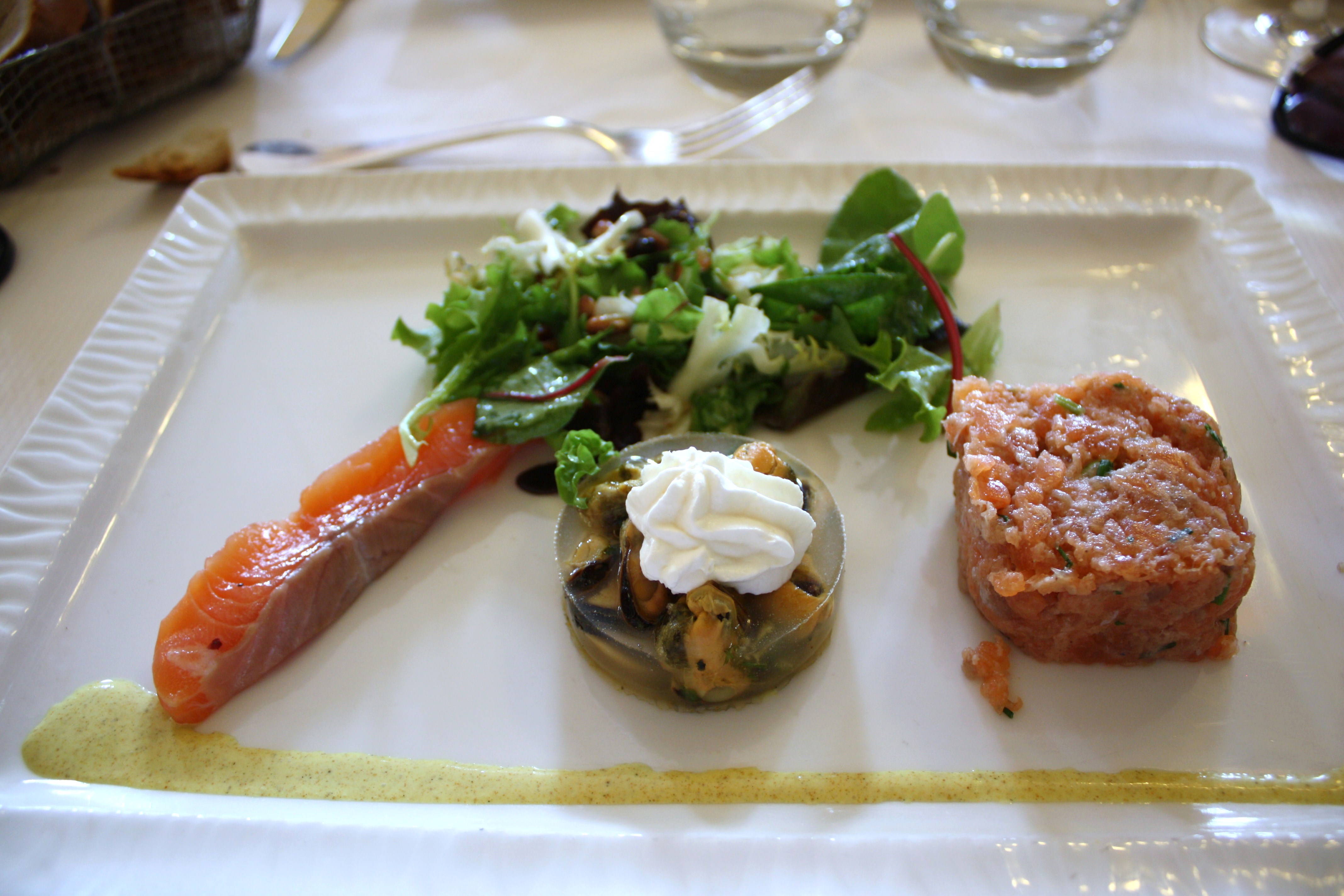 L’assiette océane avec un morceau de saumon cru, un tartare de saumon et une timbale de moules serait bien comme entrée d’un menu brasserie à 18€. C’est mangeable mais ce n’est pas à la hauteur de ce que l’on attend d’un menu à 45 € .
