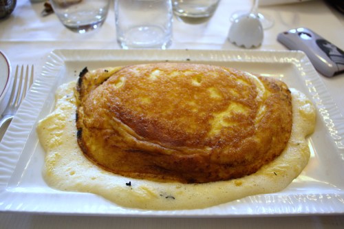 Le dessus est croquant et l’intérieur est mousseux. C’est très copieux. Mais une omelette nature comme plat principal d’un menu à 45€ ( sans les boissons ) c’est exagéré .