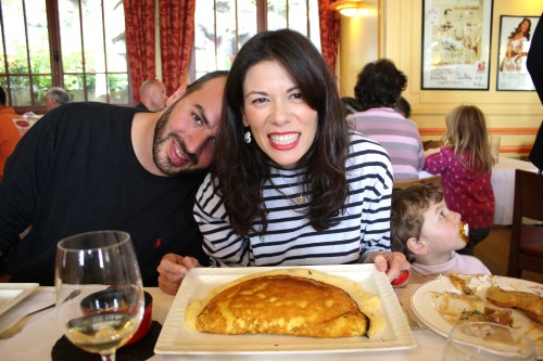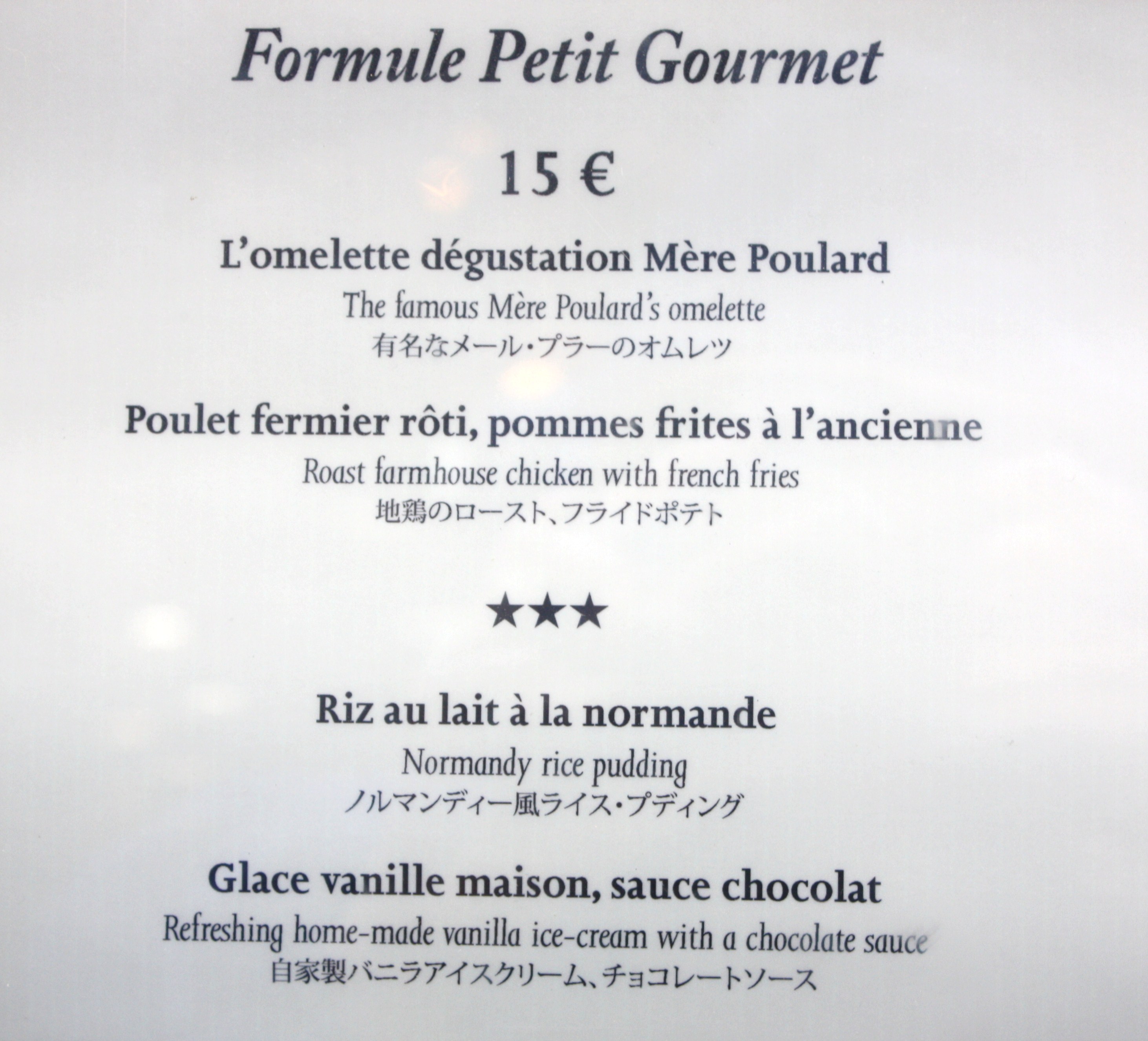 Il y a toute une petite cérémonie en vitrine avec les cuisiniers qui battent l’omelette en rythme devant la grande cheminée . Sympa .Sauf qu’il y a encore plus de monde que devant La Joconde d’où l’absence de photos .