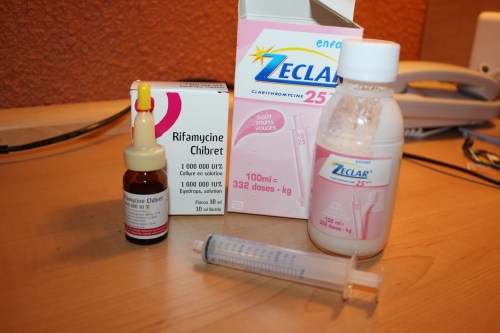 Alors, elle doit prendre une dose de Zeclar 2 x par jour pendant 7j et 1goutte dans chaque oeil de Rifamycine Chibret 5xpar jour pendant 7j.