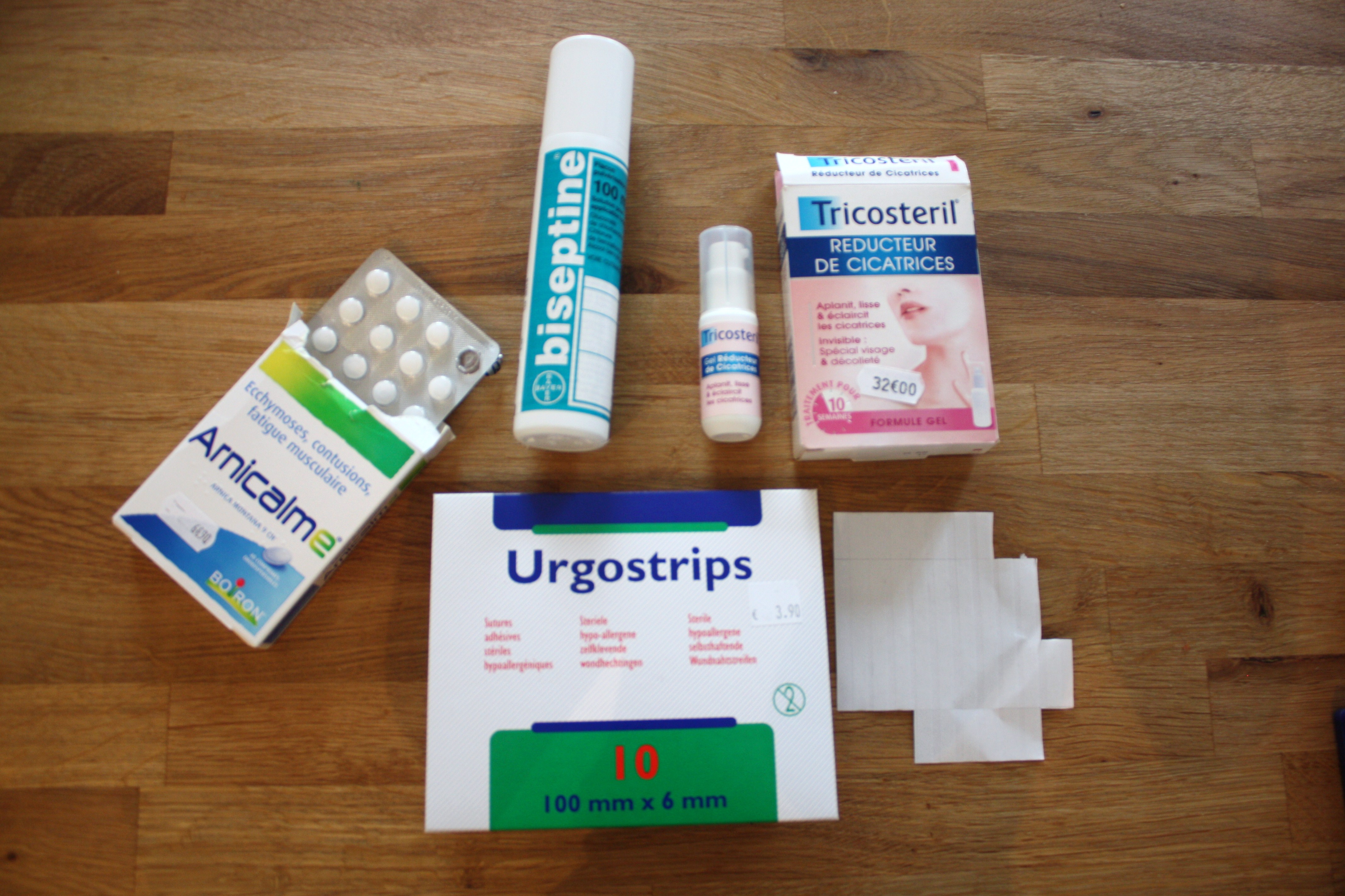 Pas besoin de points ( ouf ) mais désinfection à la Biseptine et Urgostrips pendant une semaine . Je l’ai saoulé toute la consultation parce que je voulais absolument qu’elle ne garde aucune cicatrice sur le visage ( à la base on venait pour du sang dans les selles , ce qui avait l’air de bien plus l’inquiéter que mes histoires de coquetterie ) . Et bien il n’y a apparemment rien de miraculeux pour éviter la cicatrice et tout dépend de sa peau . La mienne est merdique , j’ai deux énormes cicatrices sur le visage bien voyantes, surtout de près sans maquillage .