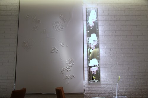 On a beaucoup parlé de la salle : toute blanche . Personnellement je n’ai pas été séduite par la décoration , la salle n’est pas toute blanche mais blanche et marron , pas très heureux . On se croirait dans un petit boudoir avec les appliques rosées et les tableaux ringards ( en cuir ?) mais les tables en bois , les sièges et les banquettes jurent avec le reste . Bof , bof , bof .C’est pas mon style .