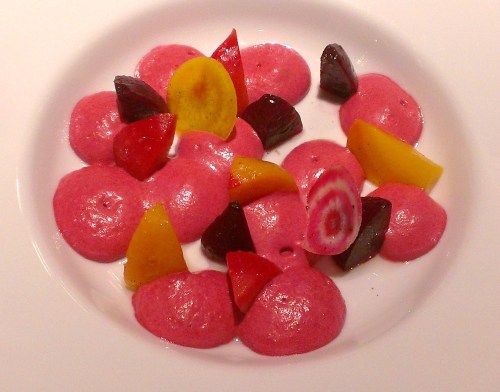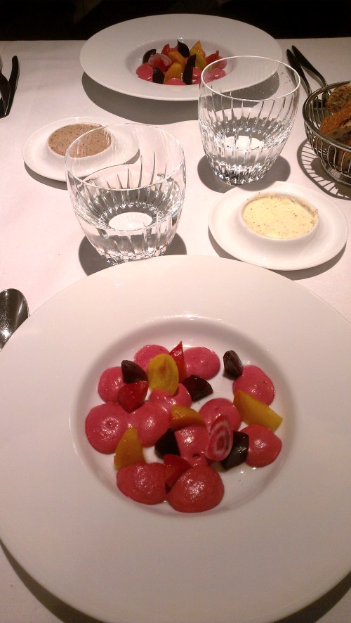 En entrée nous avons pris une assiette de betteraves , café blue mountain encore , servie tiède . Il y avait au moins 3 sortes de betteraves et ce sont les meilleures que j’ai mangées de ma vie . Un absolu délice , et pourtant je n’aime pas spécialement cela . C’était comme si j’en mangeais pour la 1ère fois de ma vie .L’assiette était d’une infinie finesse et précision .