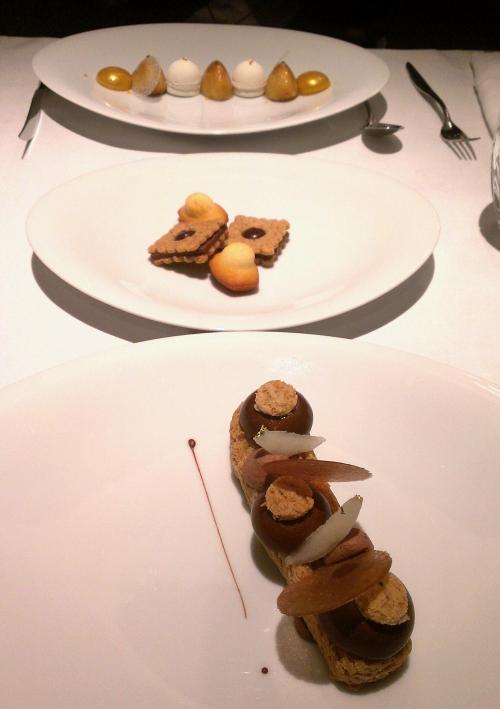 En dessert j’ai pris l’éclair poire chocolat et Arnaud le baba au rhum, fruits de la passion, gingembre , vanille . Pour vous dire la vérité ce jour là j’étais malheureusement barbouillée et c’est Arnaud qui a mangé mon dessert . Ils étaient fantastiques , d’après ses dires .