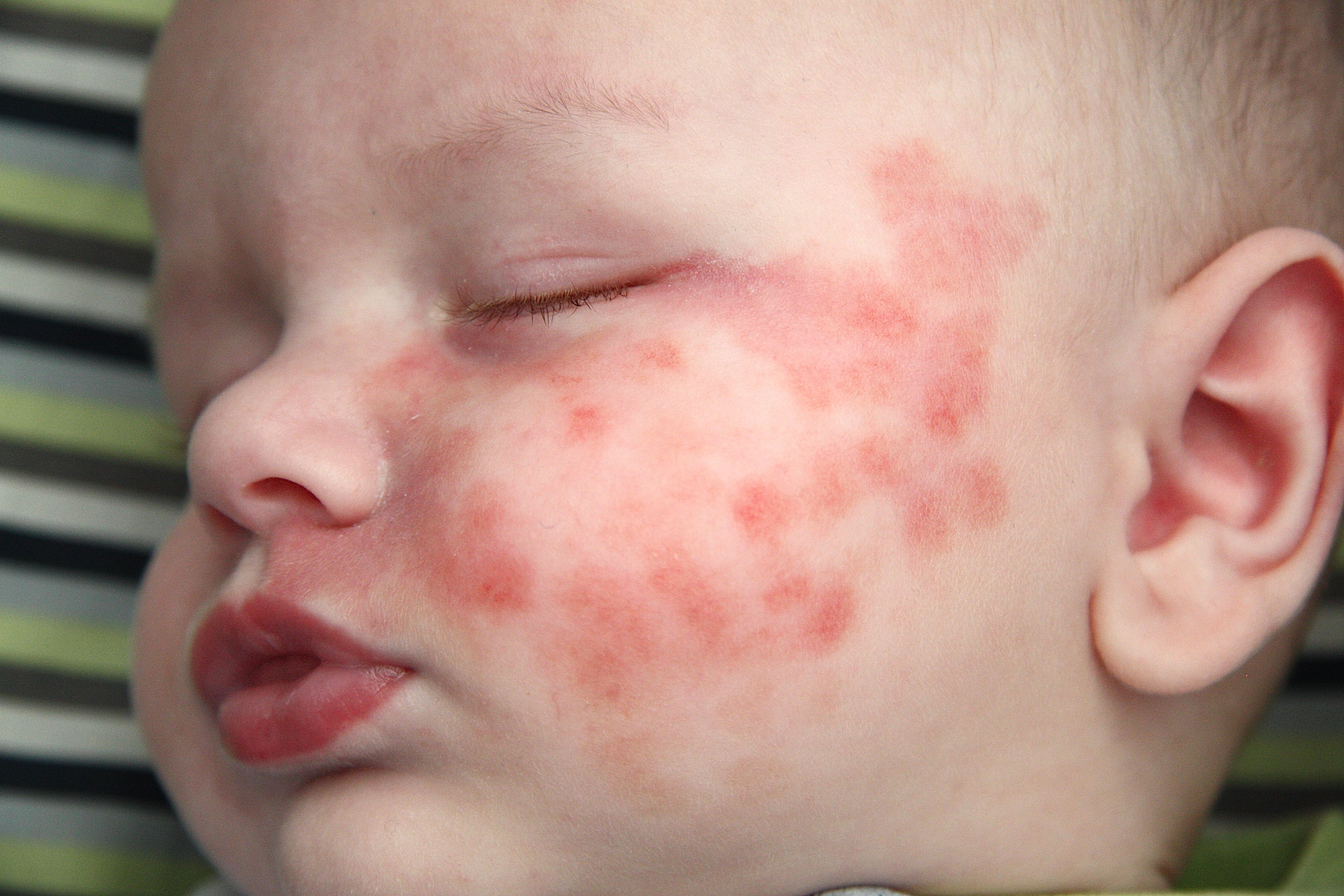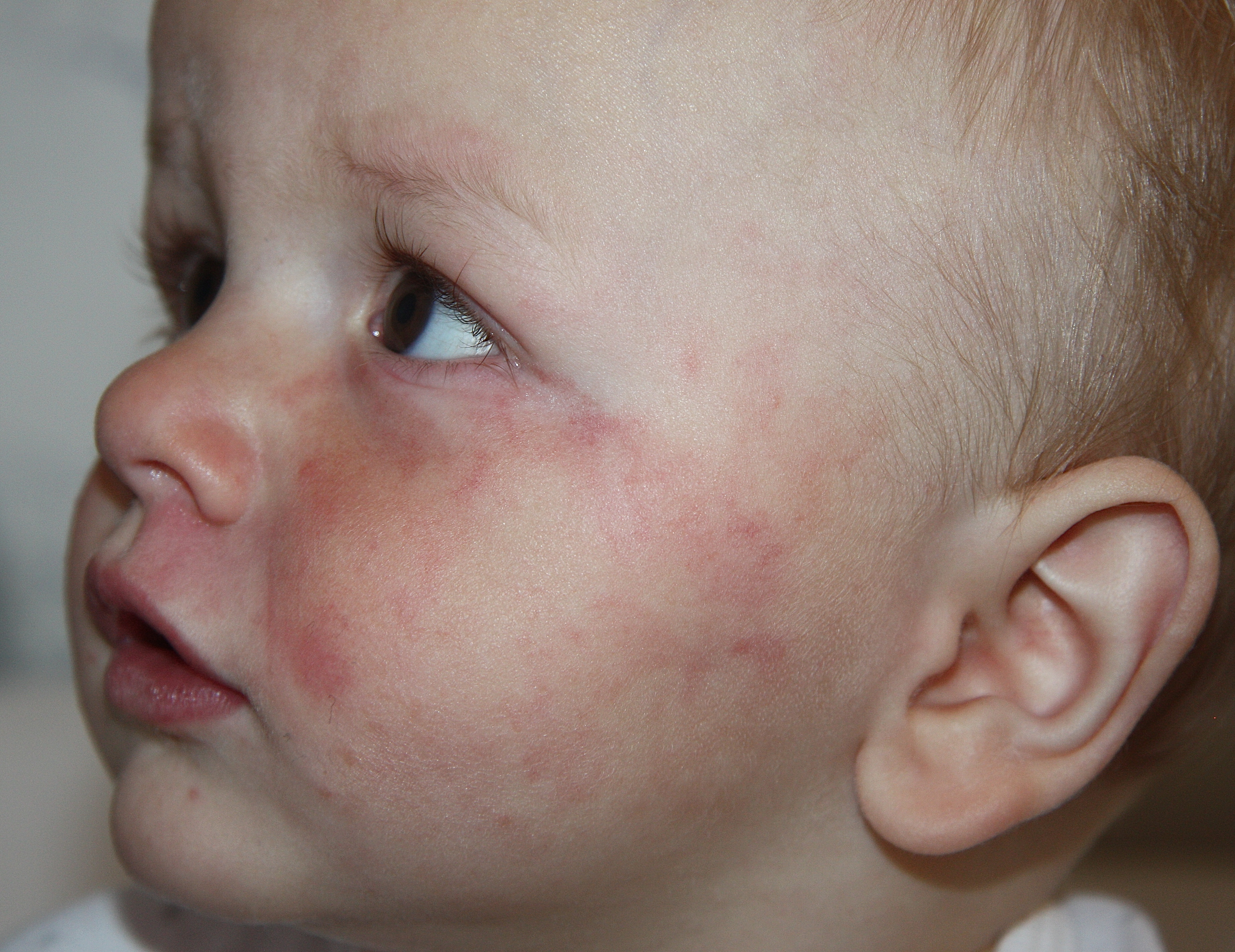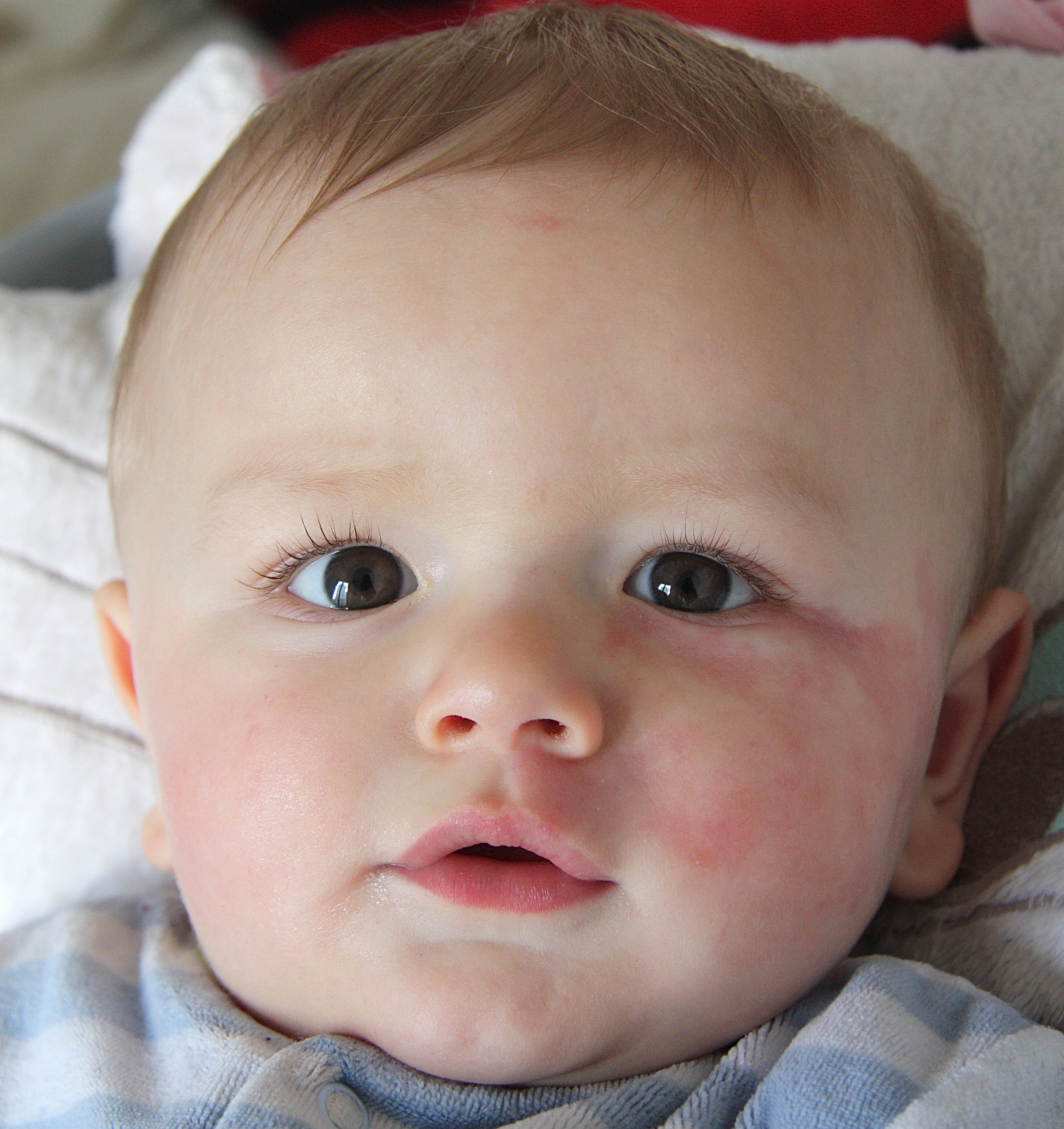 Alistair à 4 mois 1/2 , la veille de la première séance , l’angiome s’est déjà bien éclairci par rapport à sa naissance