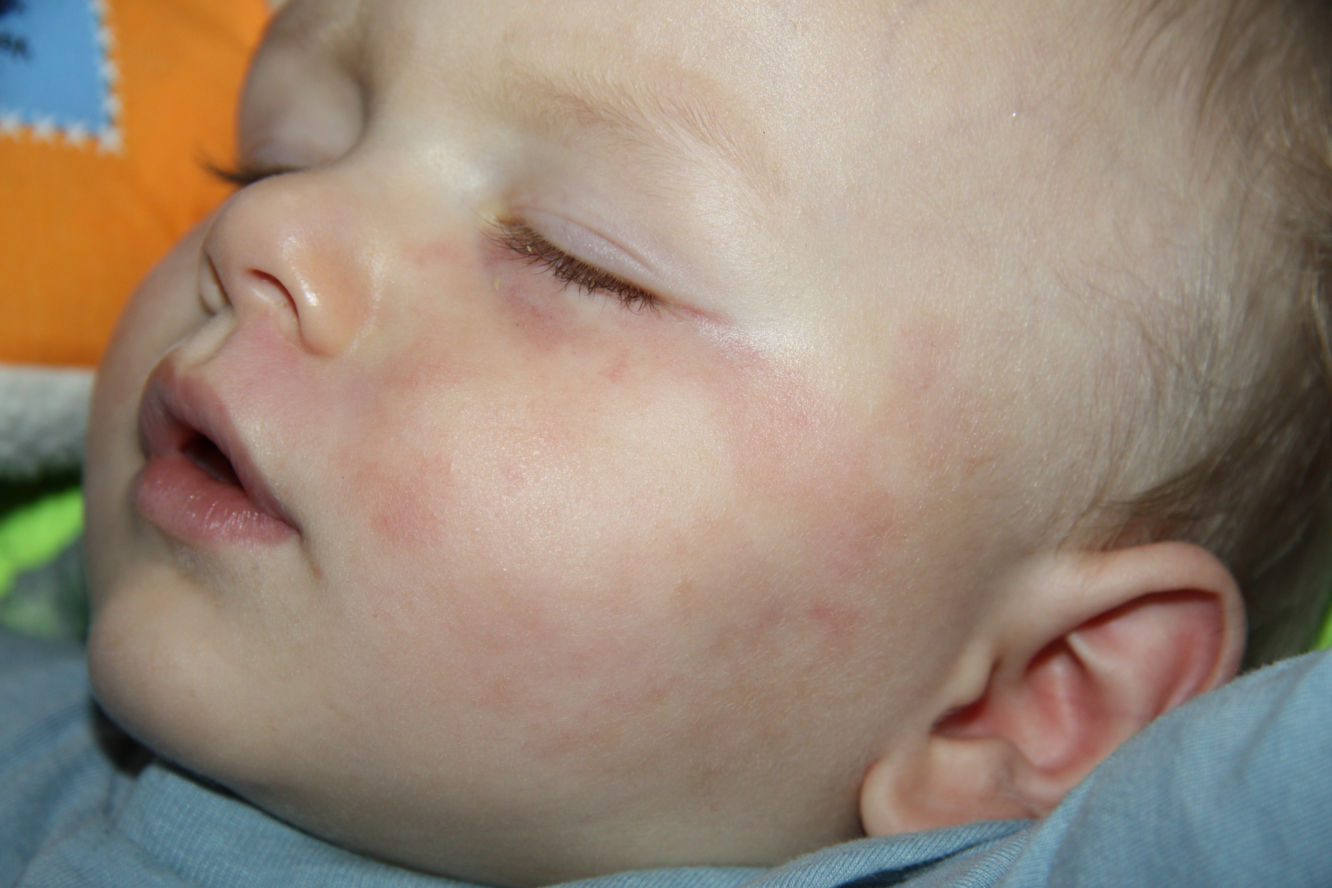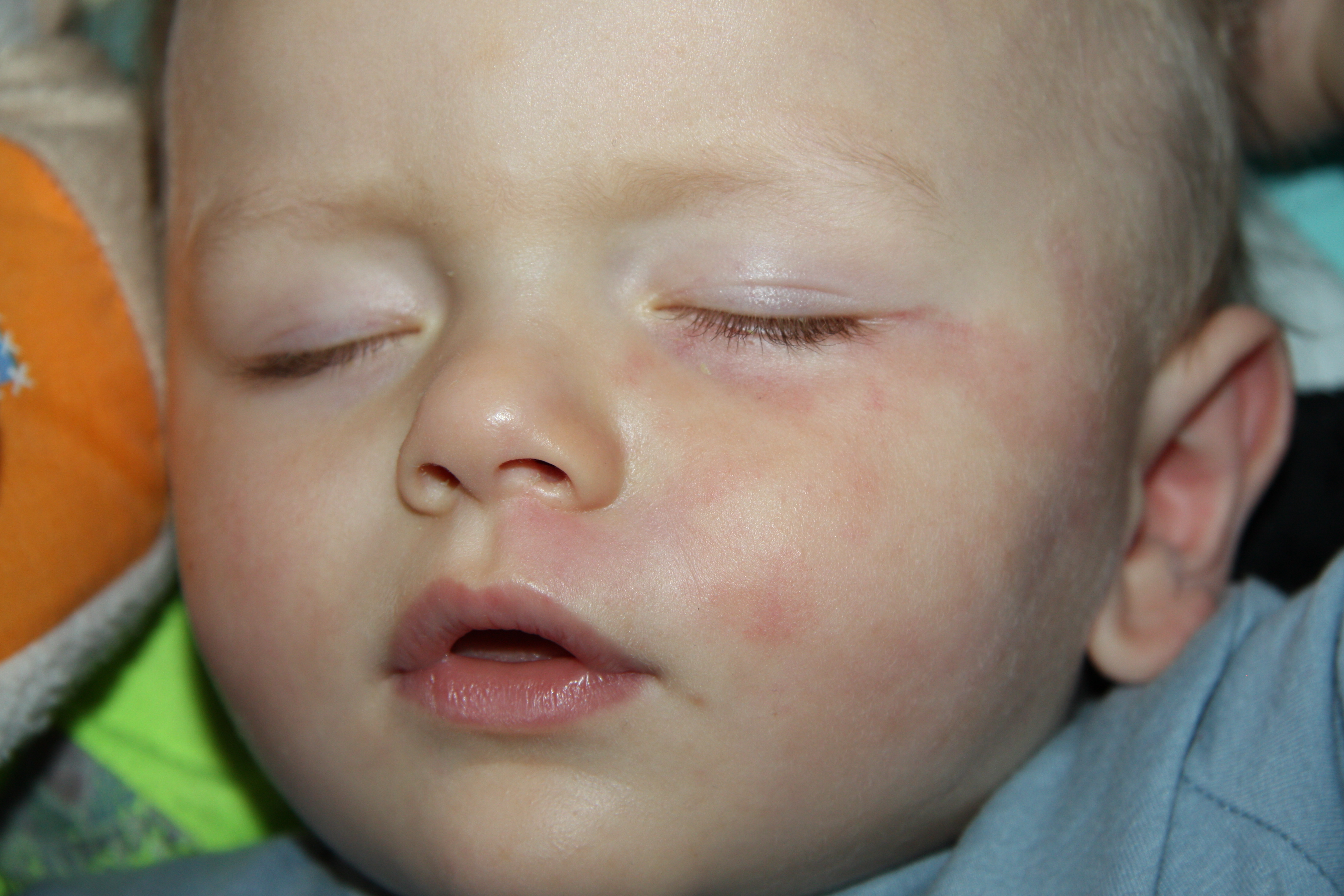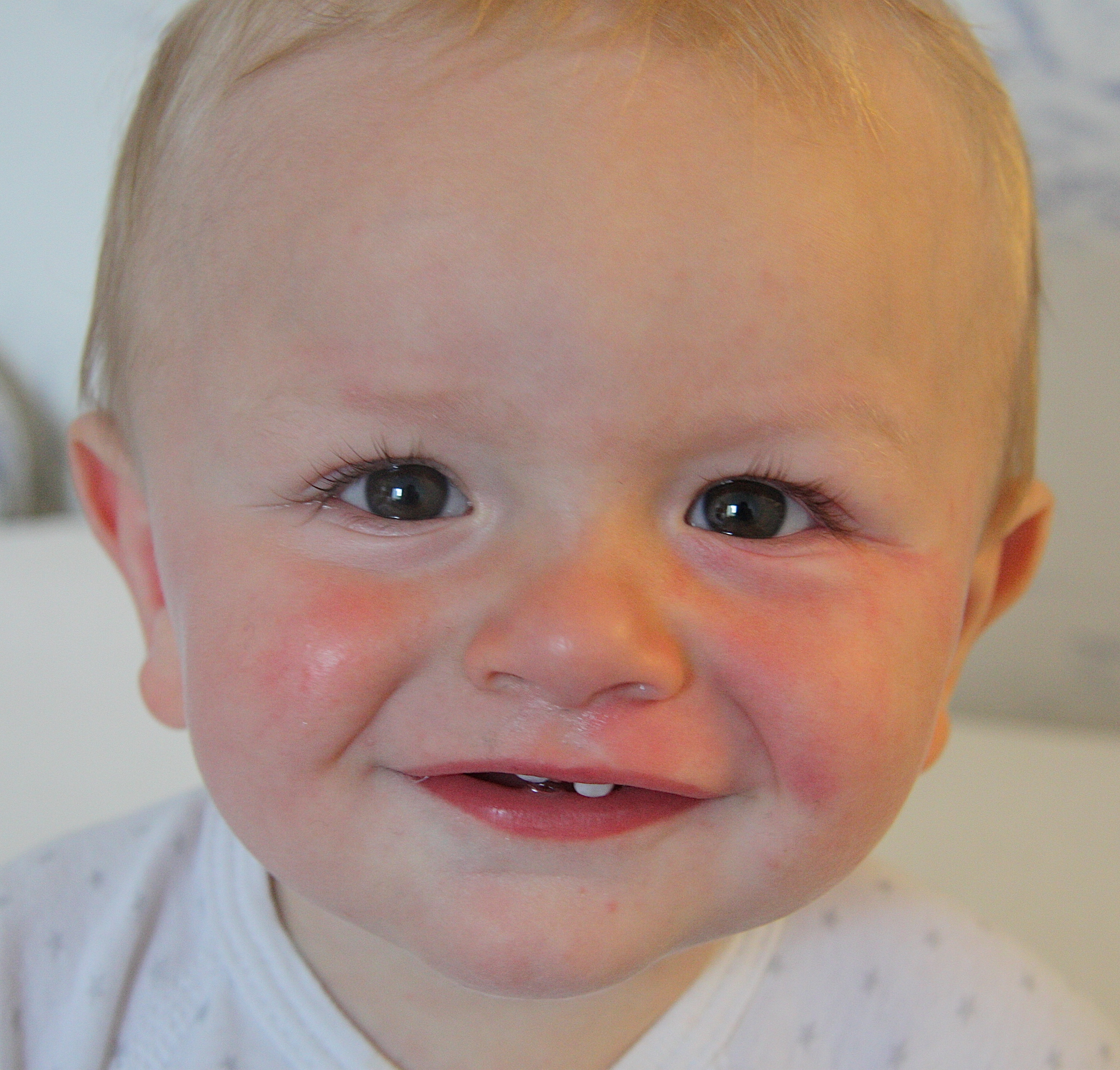 Voilà les résultats 9 semaines après la troisième séance , sachant qu’en plus il fait ses dents et a parfois les joues très rouges ce qui fausse le résultat , comme ici ( on le voit sur le côté où il n’a pas l’angiome )