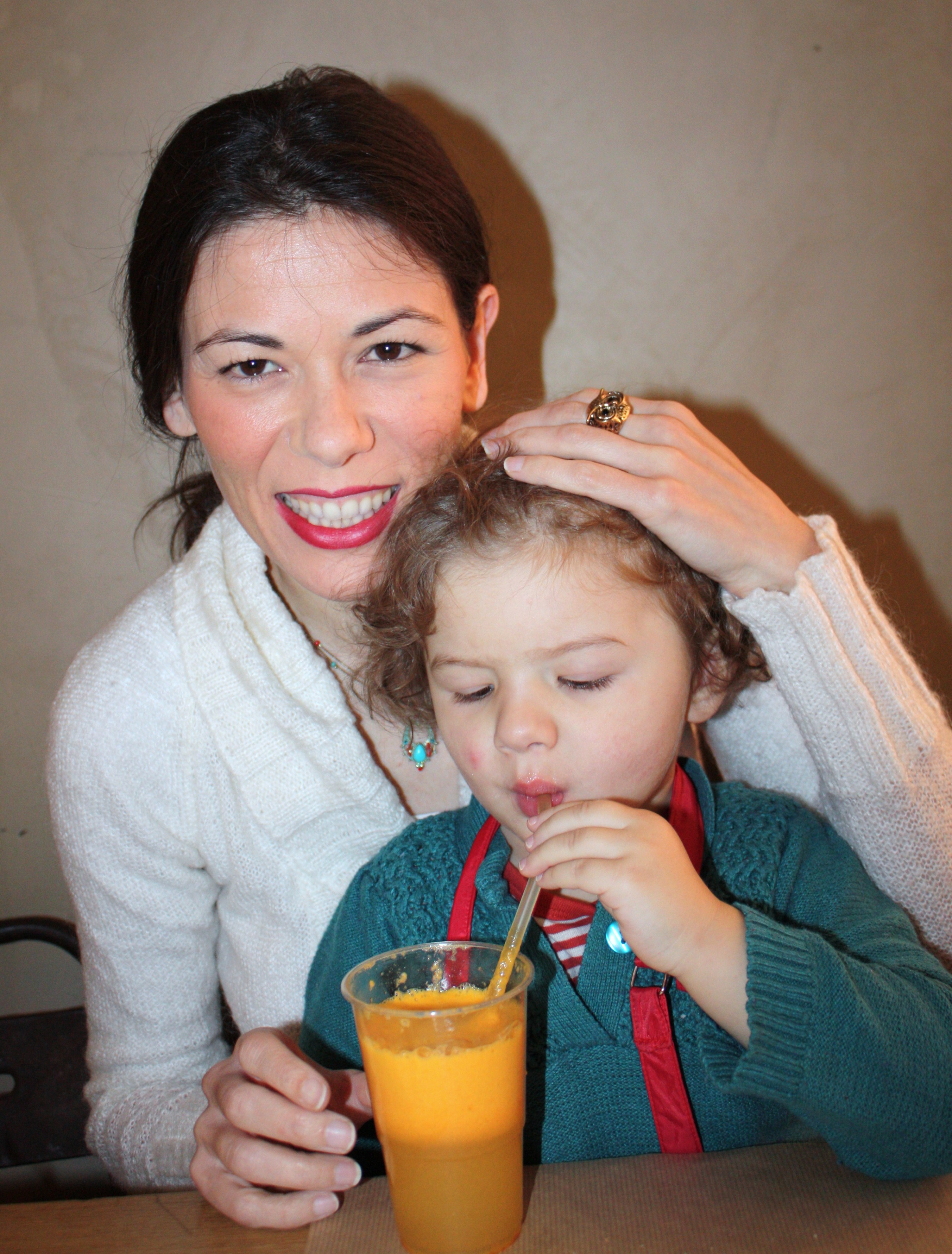 Par contre j’ai bu partagé un jus absolument délicieux : pomme, carotte, orange, gingembre avec une petite cuillère d’acérola en poudre .J’aurais pu mettre aussi une cuillère de spiruline ( algue ), guarana ou maca et j’adore ce concept de la boisson santé fraîchement pressée.